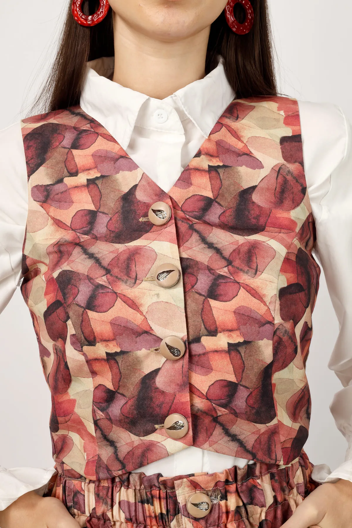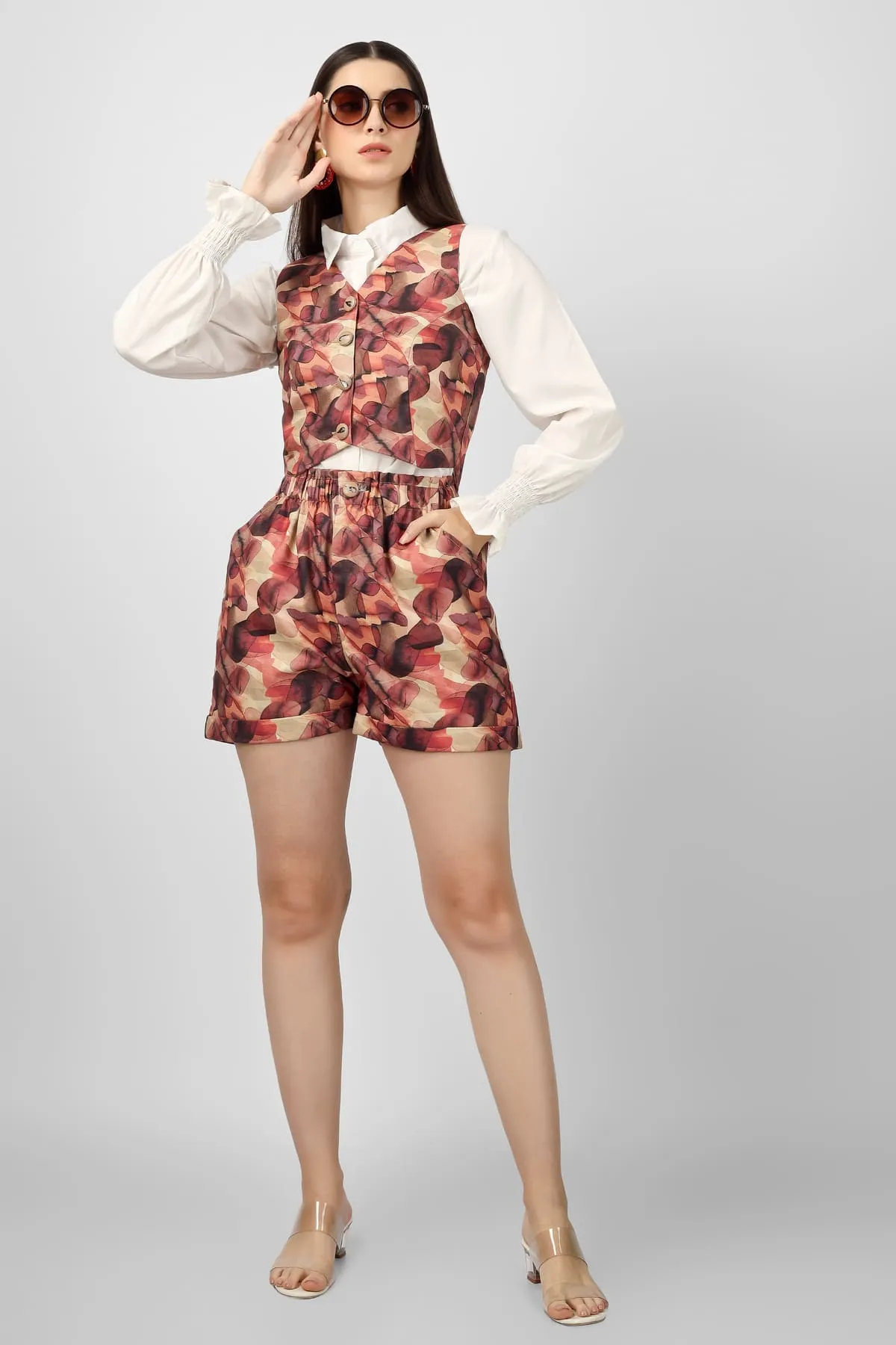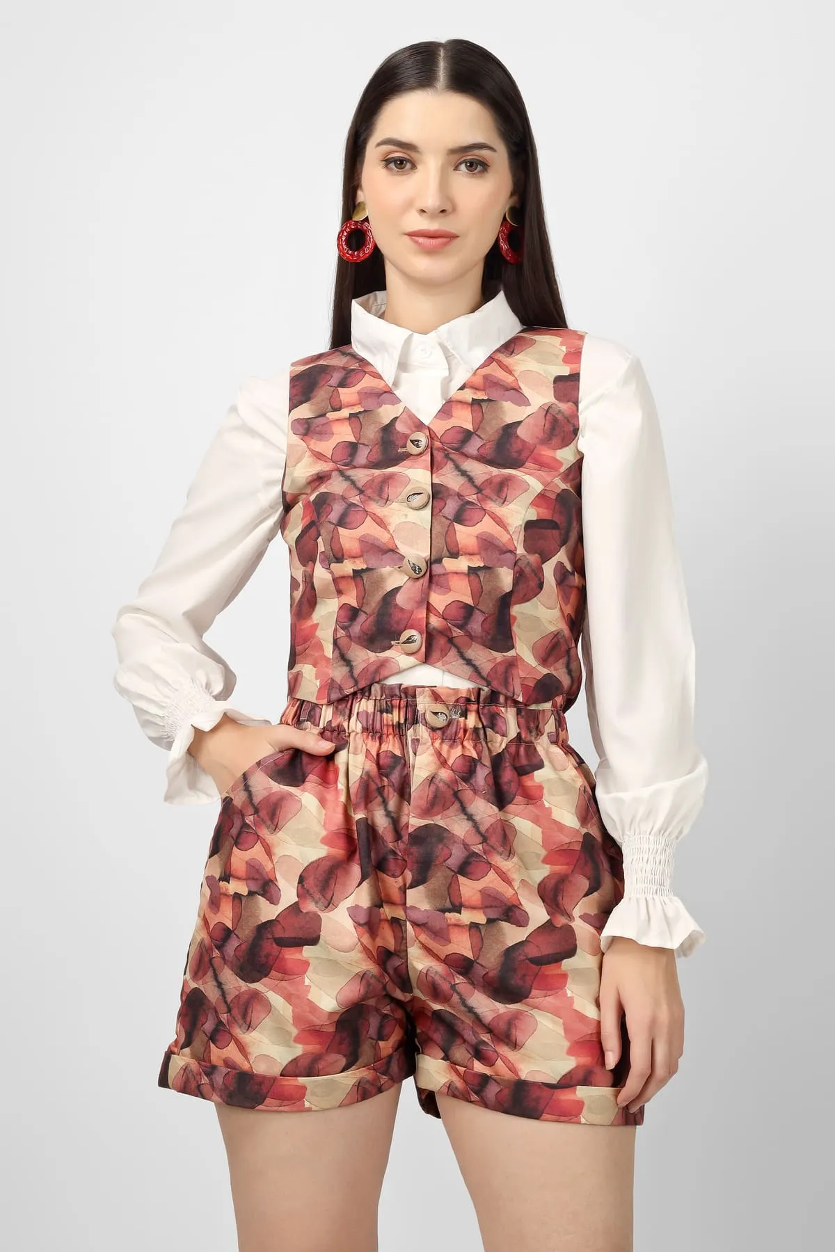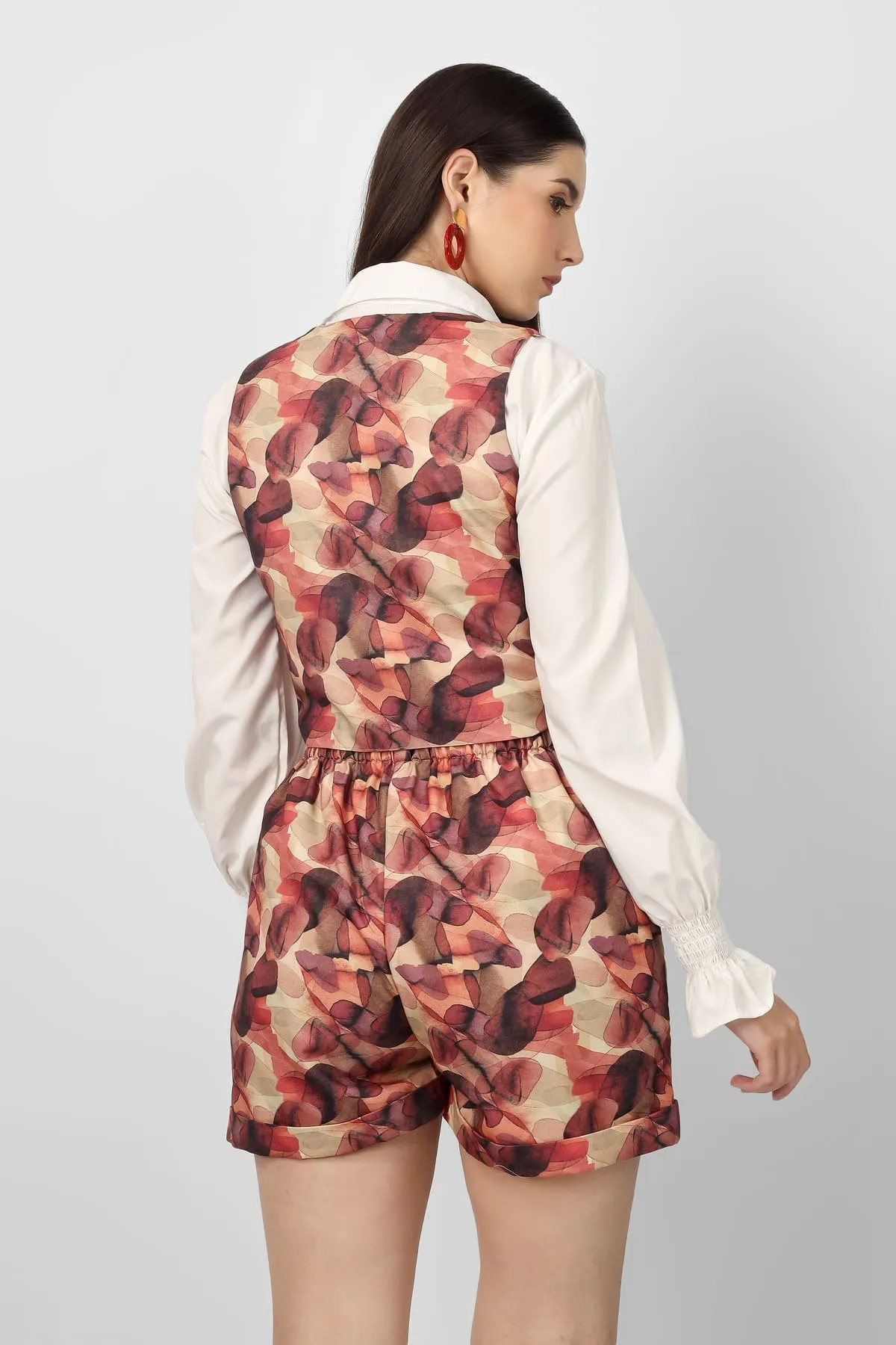 Featuring a soft abstract cropped waistcoat made from a bio washed cotton poplin and coordinated bottom that emphasise the beautifully high waist paper bag shorts.