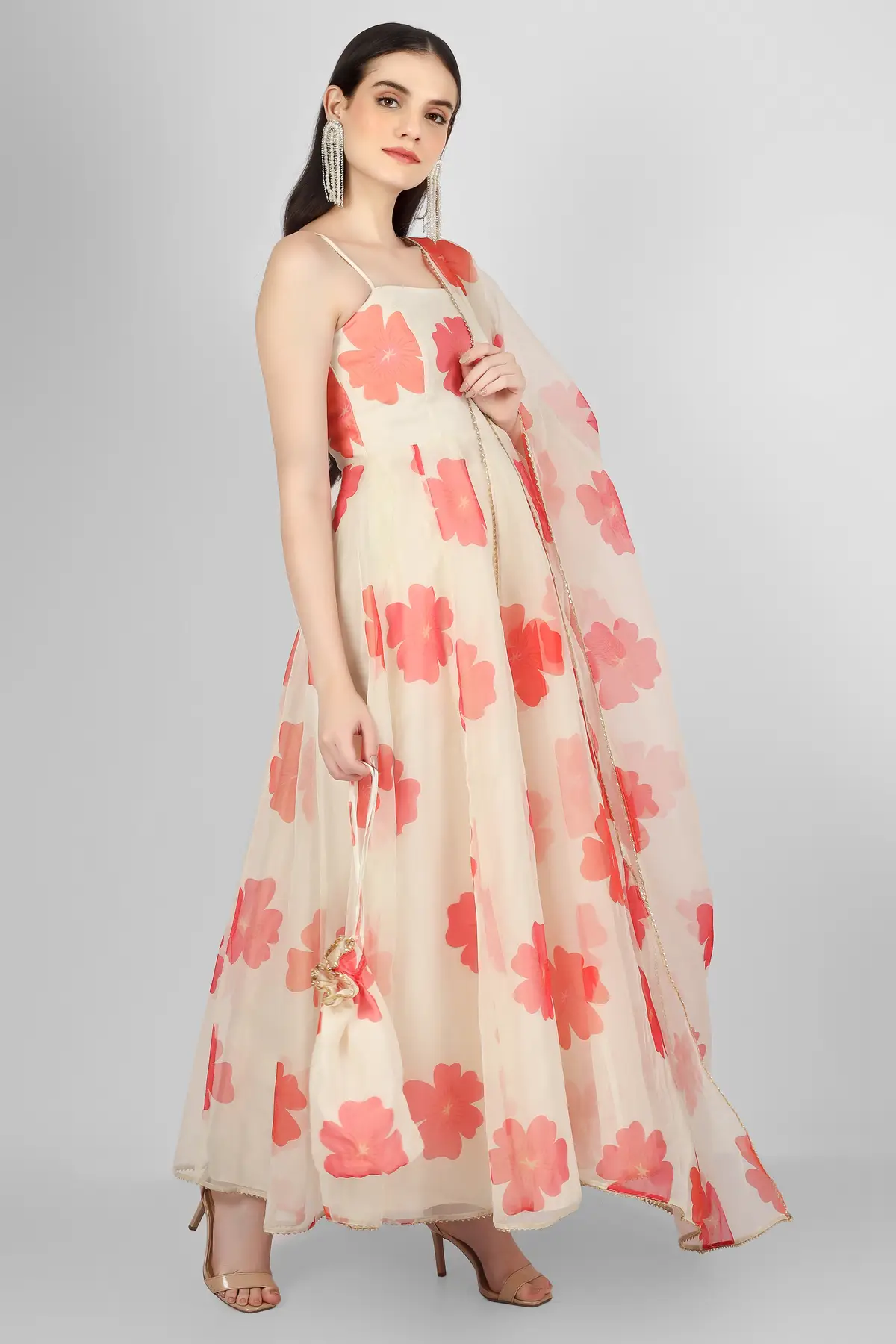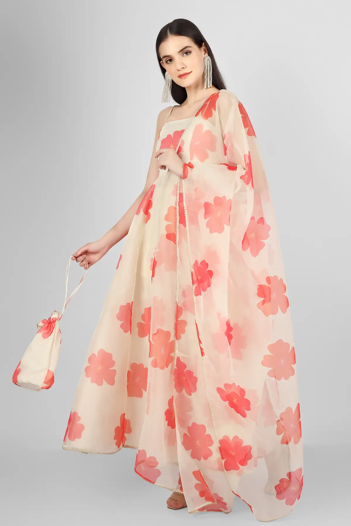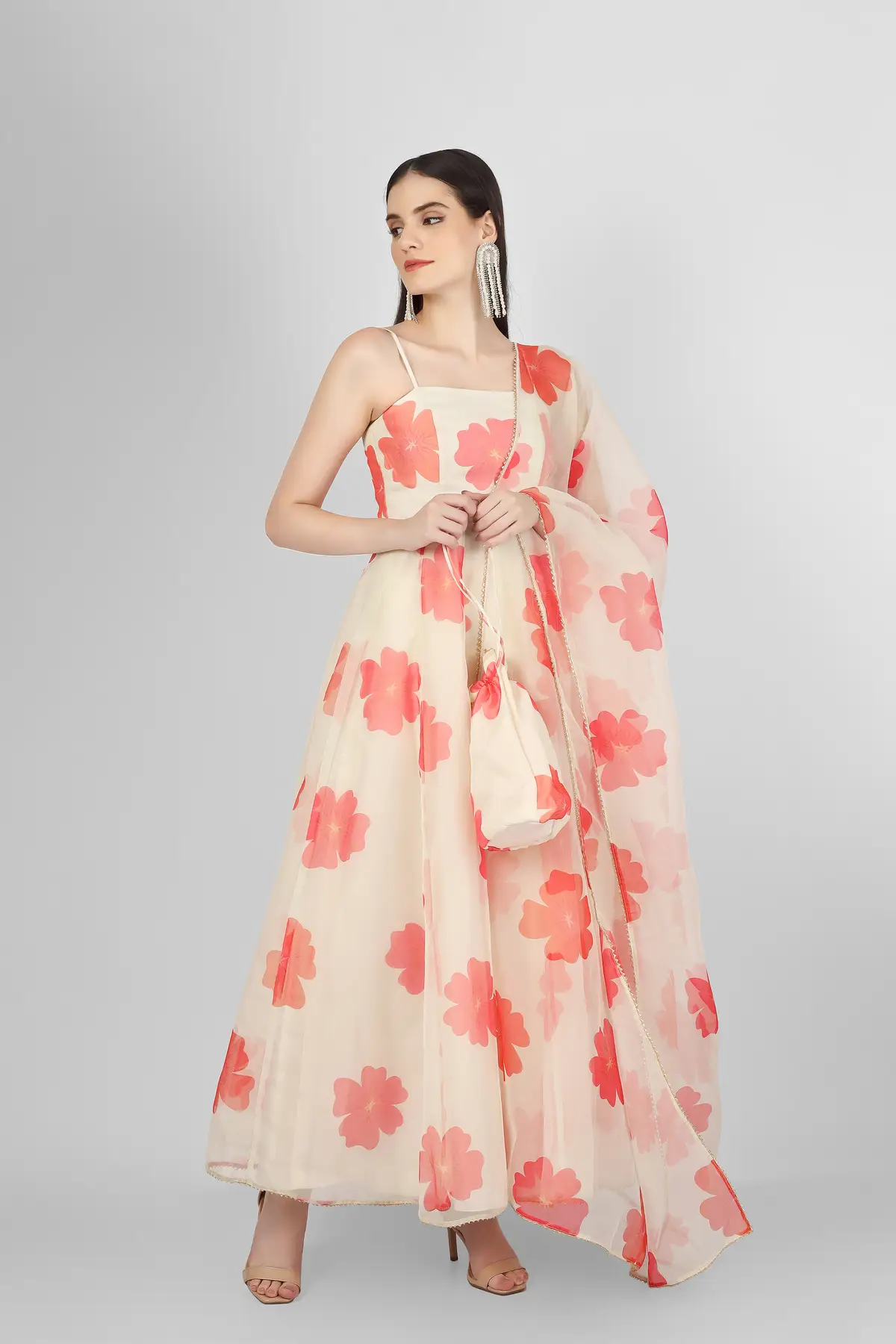 – Anarkali Suit, Organza Dupatta, Silk blend Pants, Potli bag
