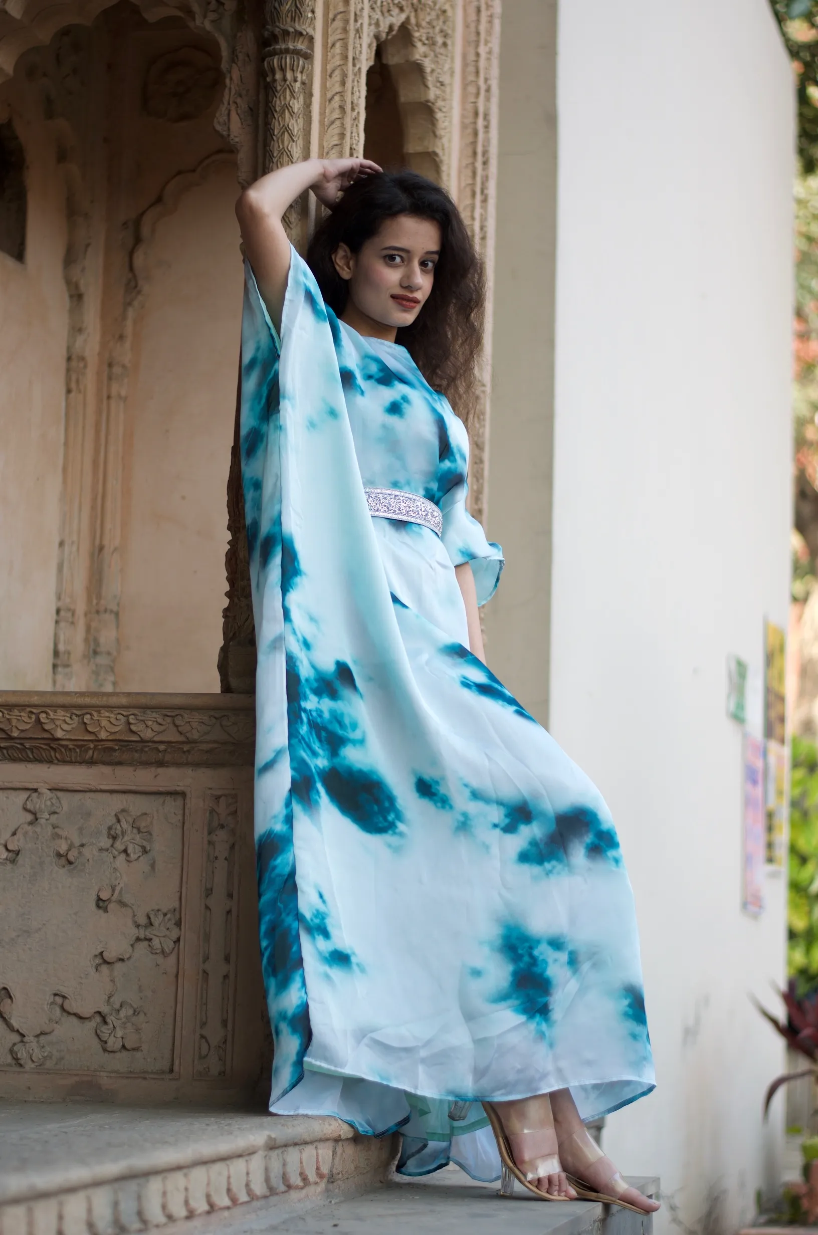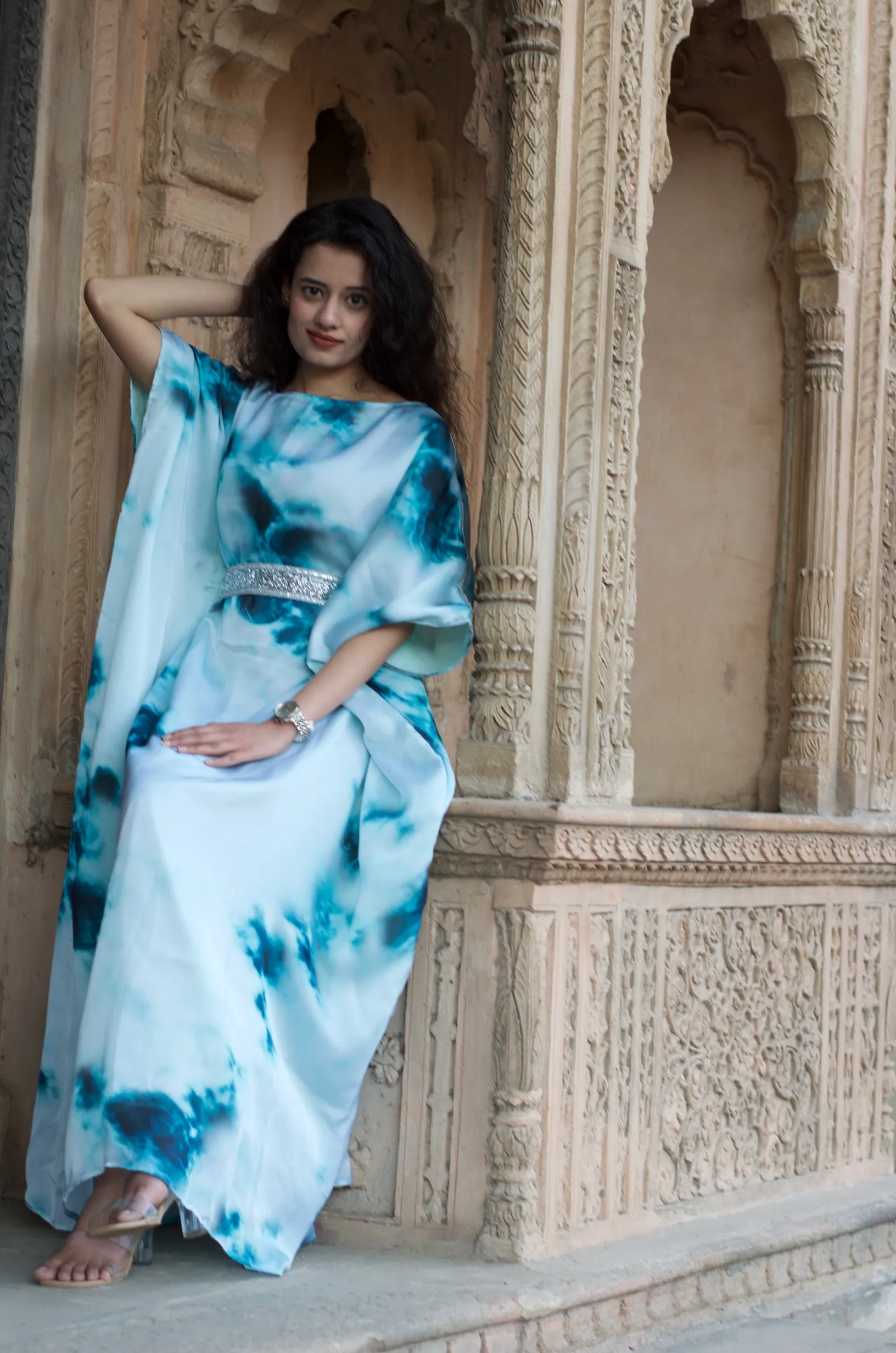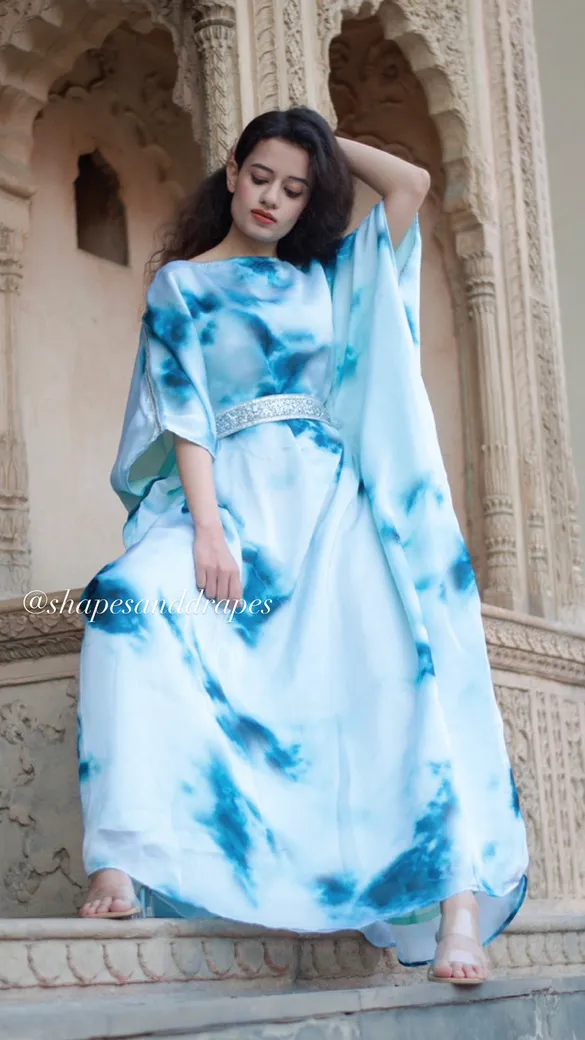 Lounge around or attend festive gatherings stress free in style and comfort in our tie – dye belted Kaftan crafted in a breathable satin fabric with lace over the shoulders and a belt, this piece is surely to become a wardrobe staple to wear from day to evening. It has a boat neckline, 3/4 sleeves and the floor length perfect to attend day parties and events.